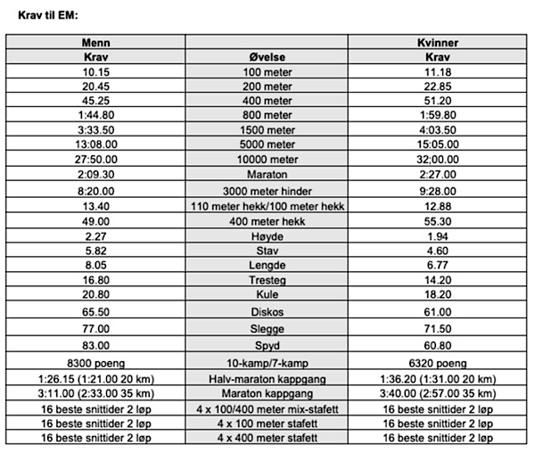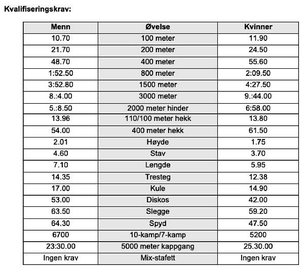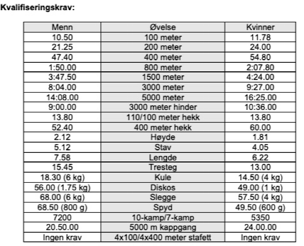 (* Norges kvalifiseringsperiode går til 20. juli). - I tillegg til å ha klart kravet til mesterskapet skal utøver ha resultater opp mot kravet for å kunne bli tatt ut.